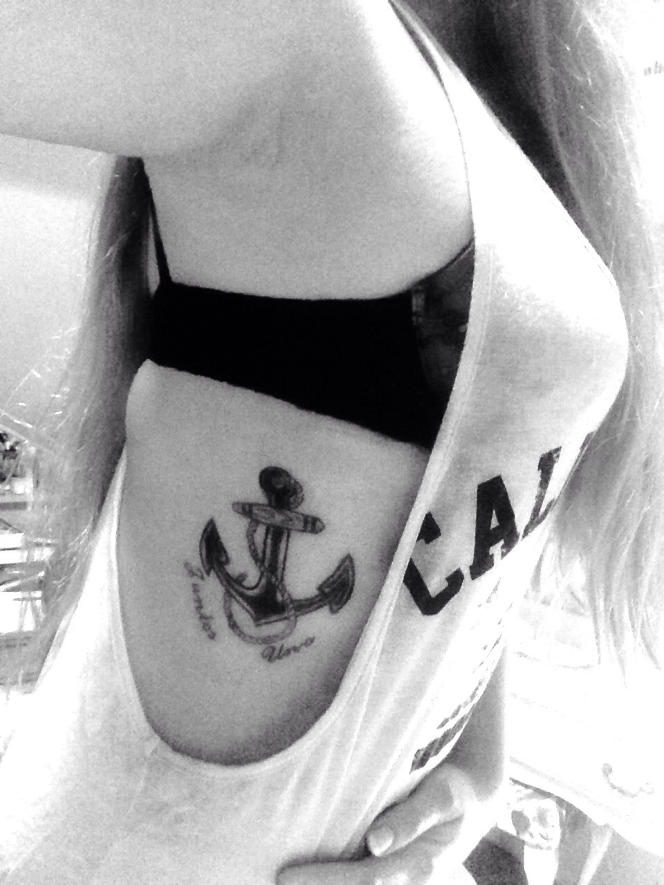 Black And Grey Navy Anchor Tattoo On Side Leg