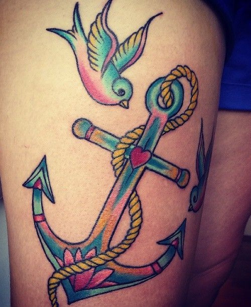 Red Rose Flowers And Anchor Girl Tattoo On Thigh
