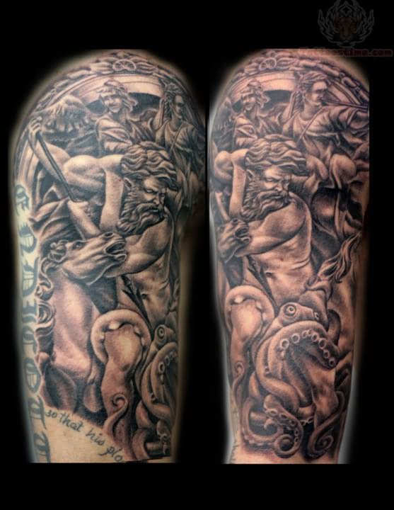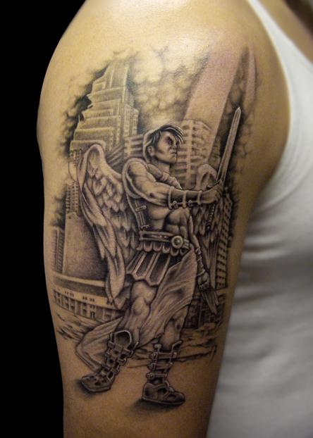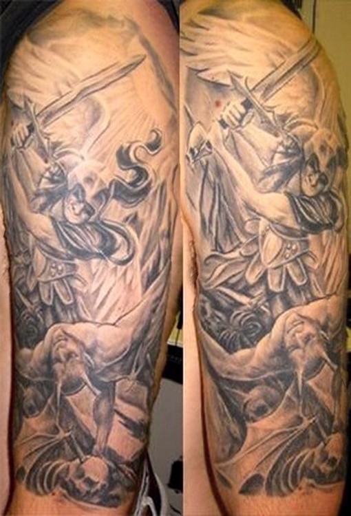 Warrior Angel Grey Ink Tattoo On Half Sleeve