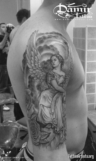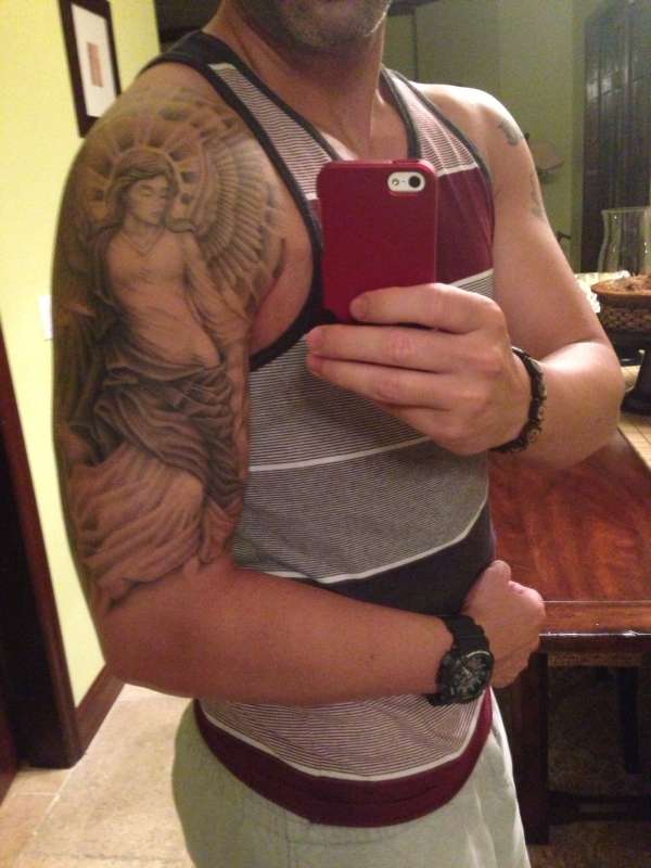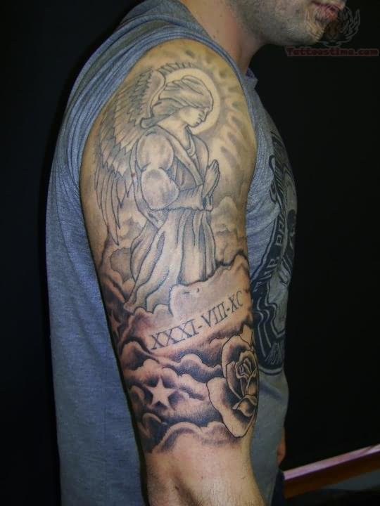 Grey Angel Tattoo On Half Sleeve For Men