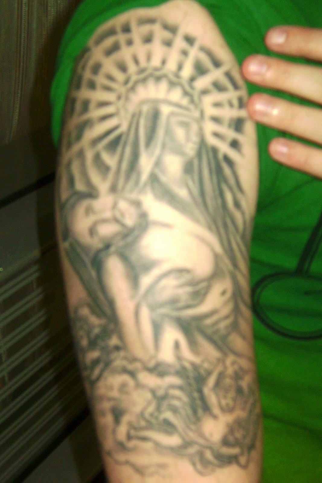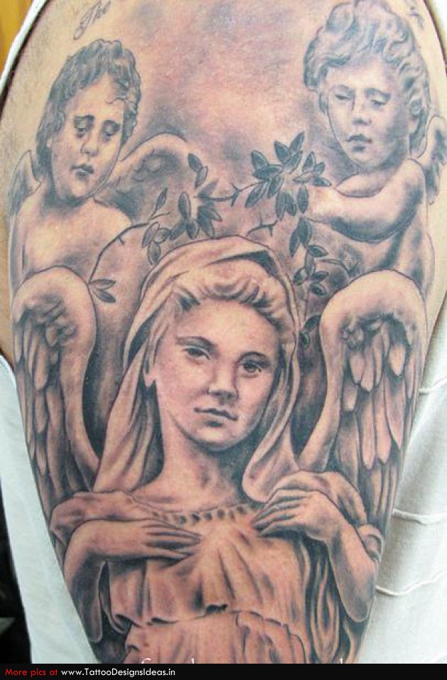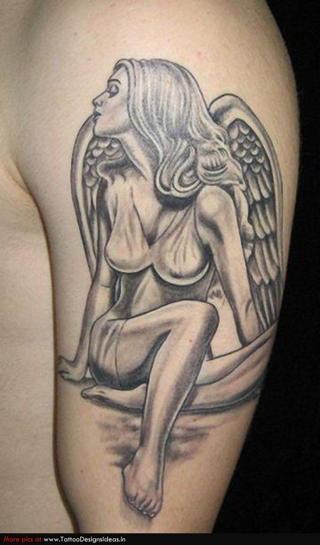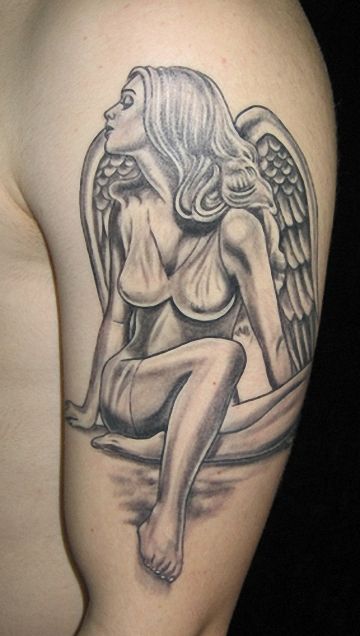 Grey Ink Angel Tattoos On Half Sleeve