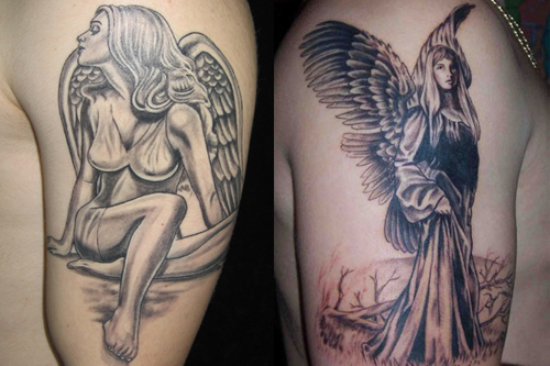 Grey Ink Angel Tattoos On Man Right Half Sleeve
