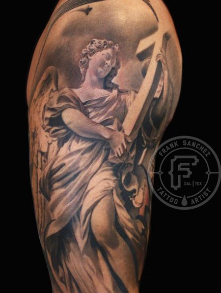 Grey Ink Angel With Cross Tattoo On Half Sleeve