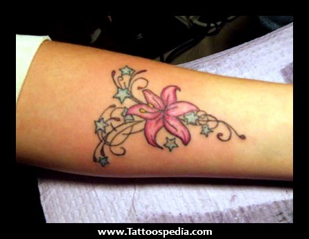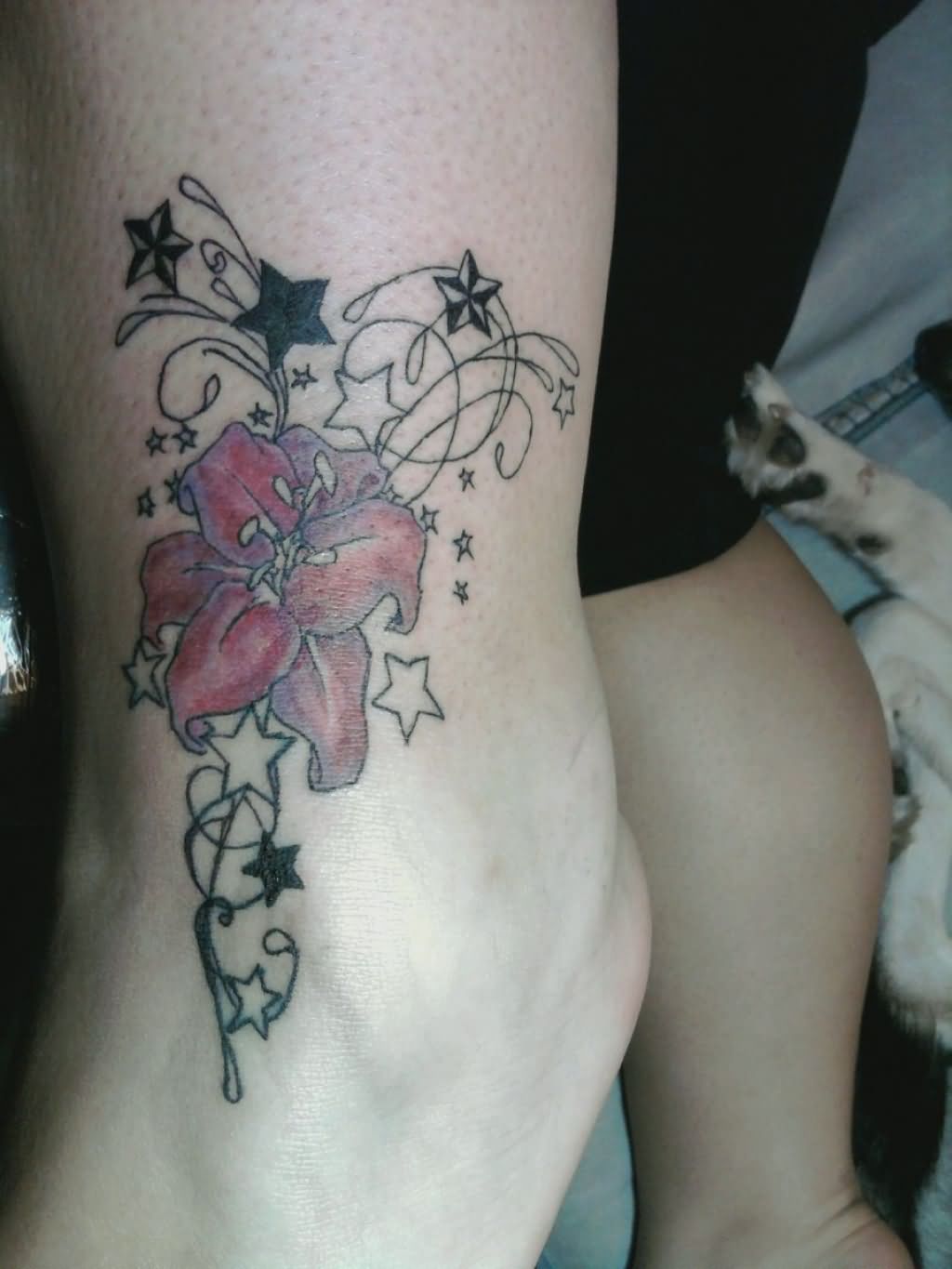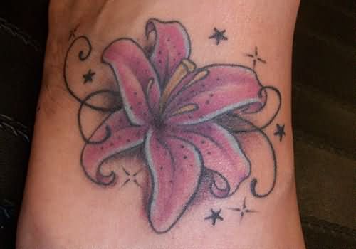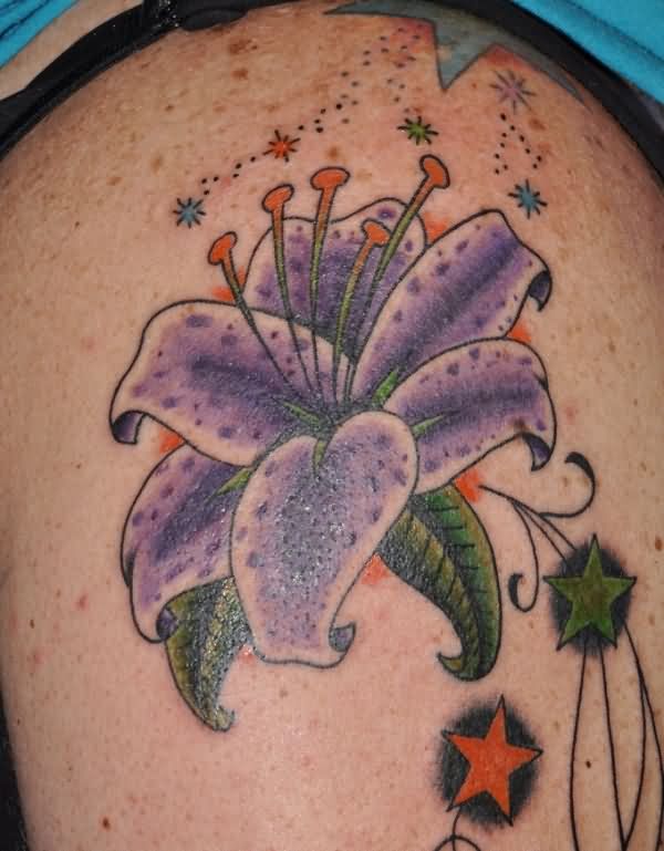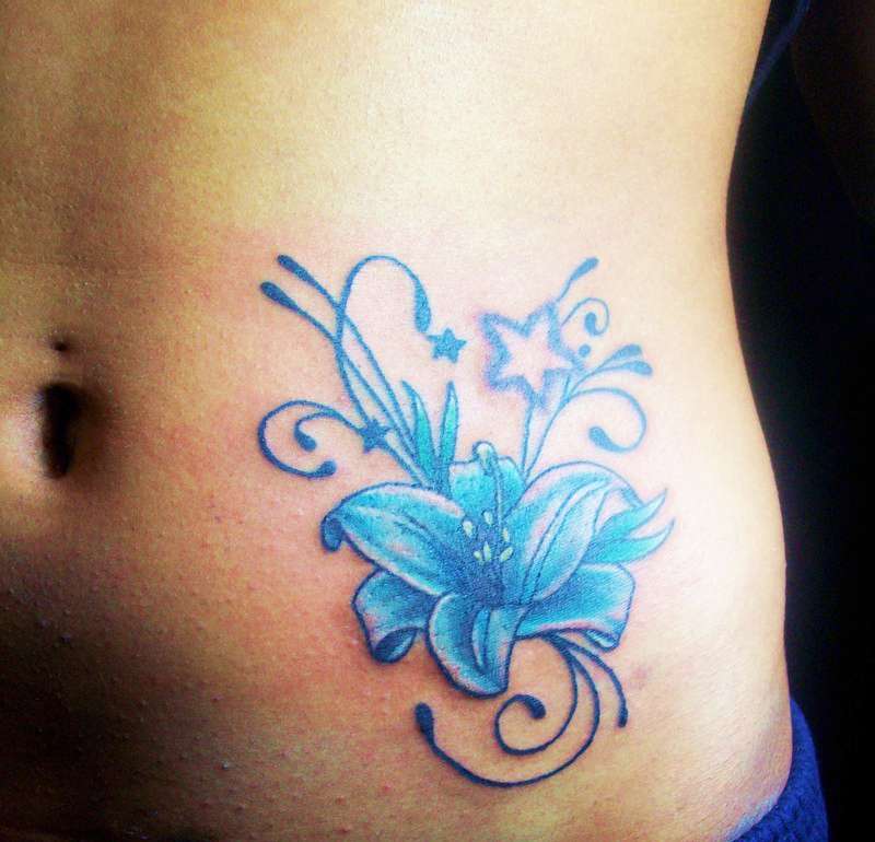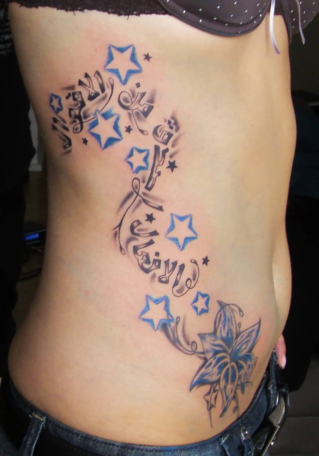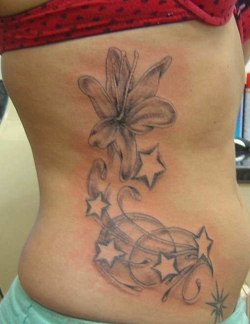Lily Flower And Blue Stars Tattoos On Side Rib