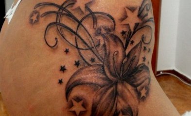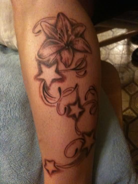 Grey Ink Stars And Lily Flower Tattoo On Leg Sleeve