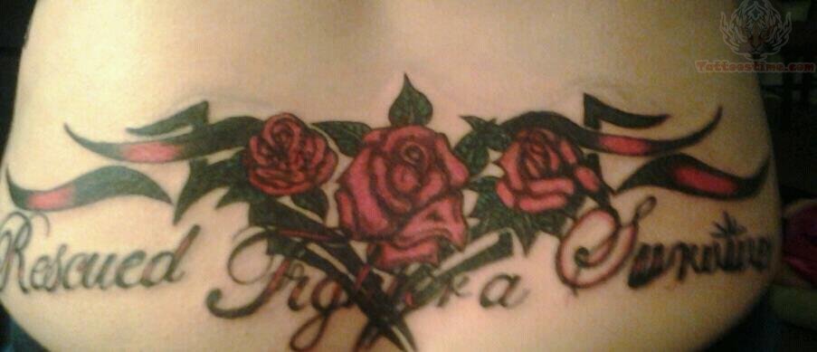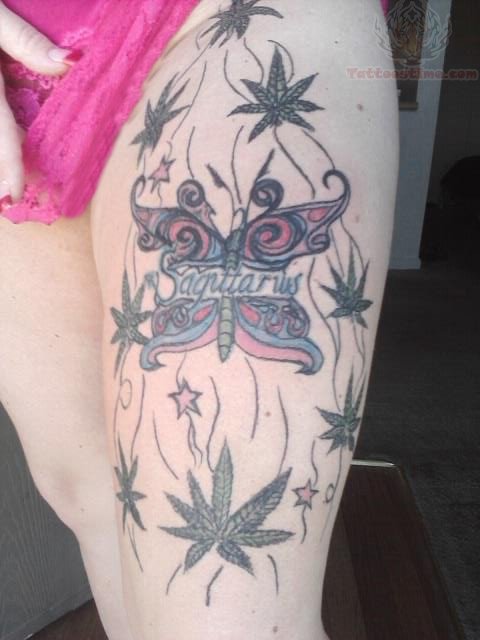 Butterfly And Clover Leaves With Sagittarius Word Tattoo On Thigh