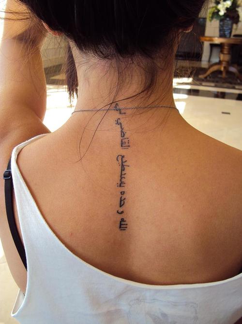 Nice Arabic Tattoo On Girl Upperback