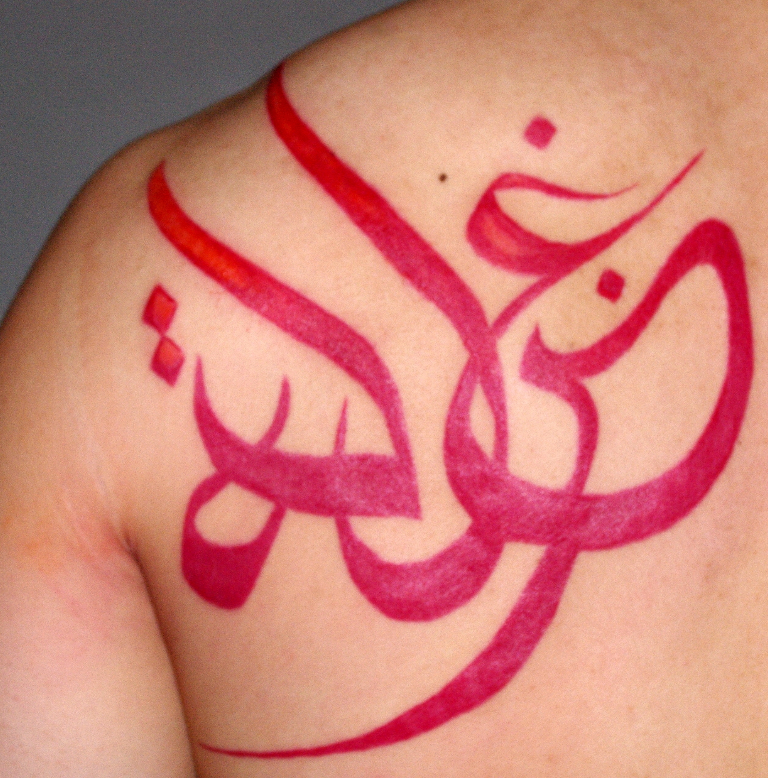 Red Ink Arabic Tattoo On Back Shoulder