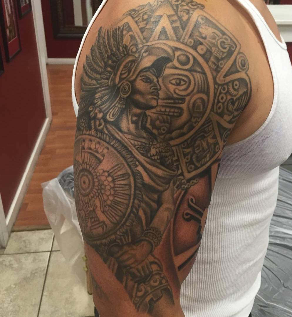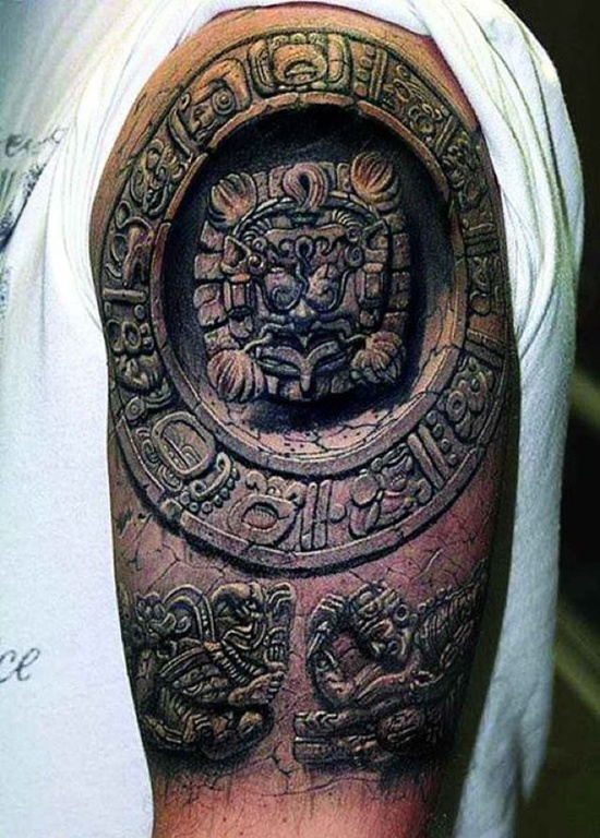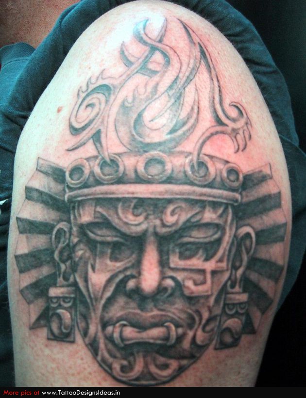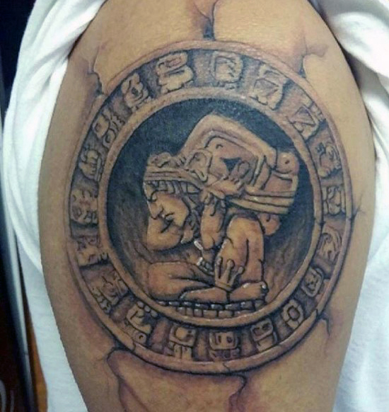 Man Right Half Sleeve Aztec Tattoo On Shoulder