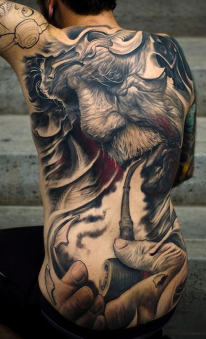 Full Back Tattoo With Grey And Black Ink For Men
