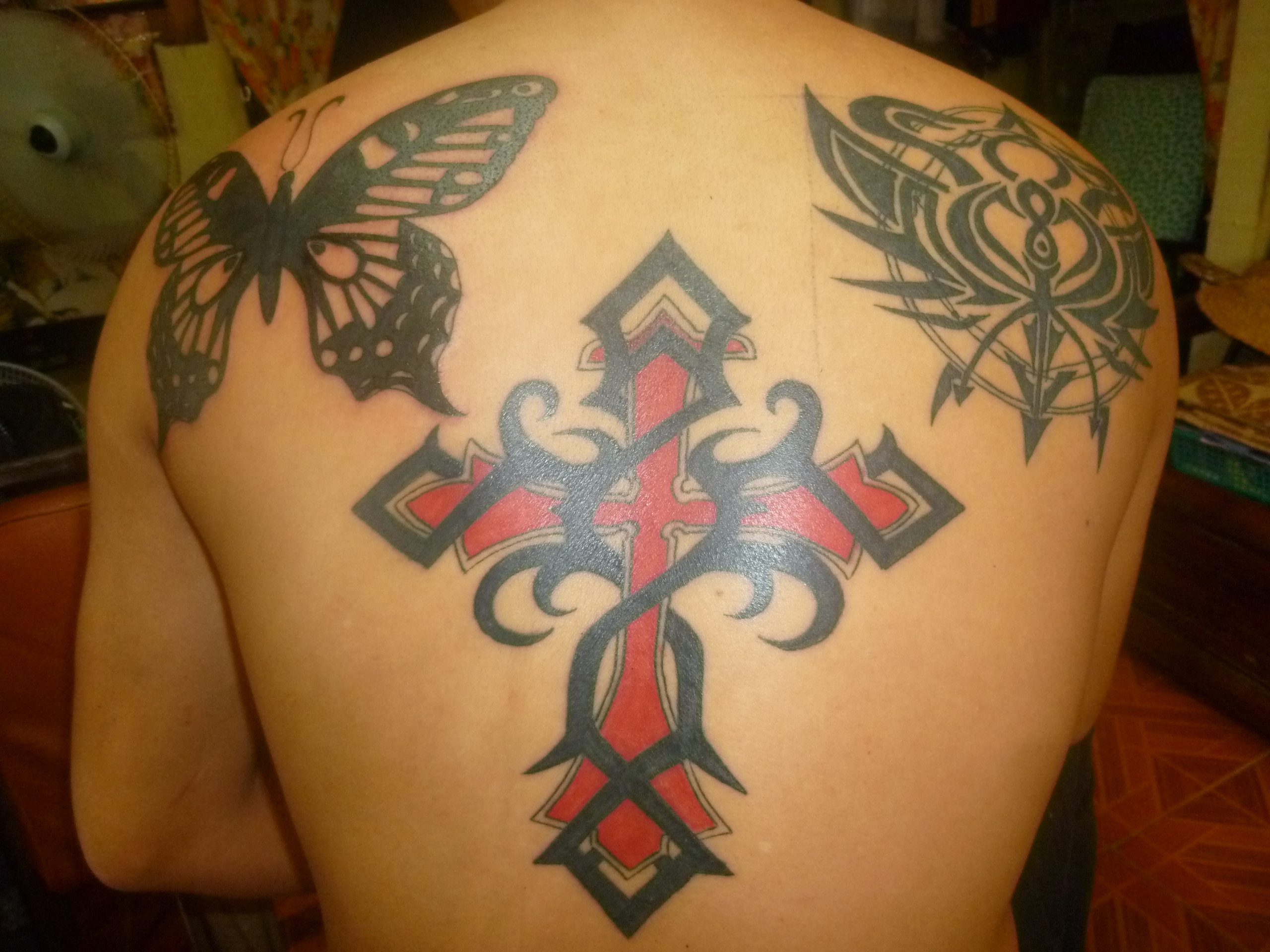 Butterfly And Cross Tattoo On Back