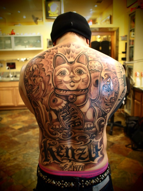 Grey Ink Japanese Money Cat Tattoo On Full Back