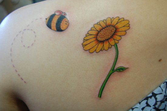 sun Flower And Bee Tattoo On Left Back Shoulder