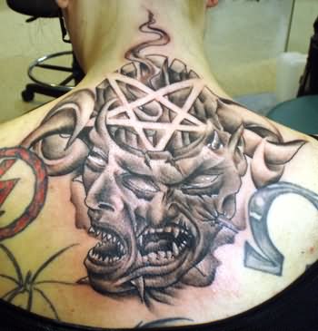 Horned Demon Tattoo On Right Back Shoulder