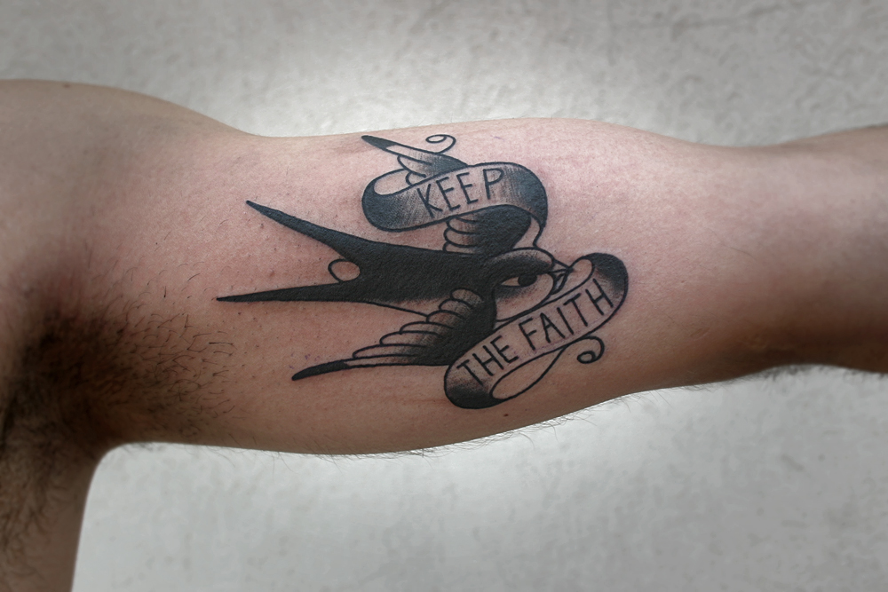 Flying Bird With Keep The Faith Banner Tattoo On Bicep