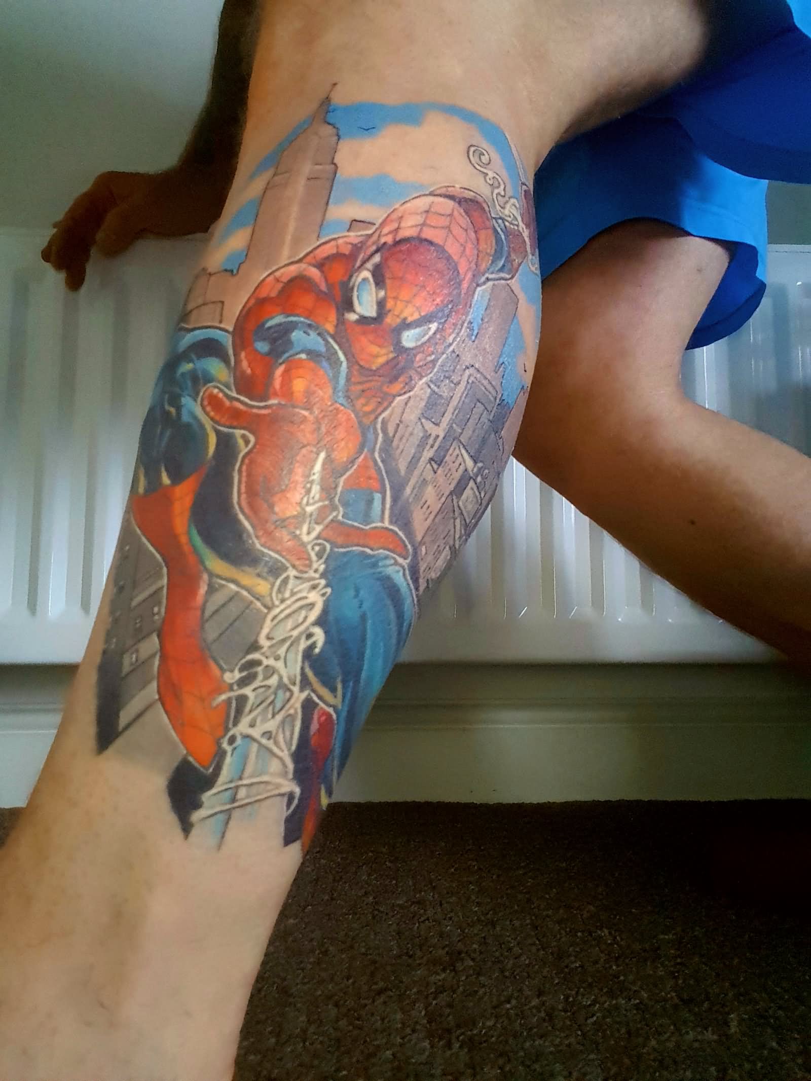 Spider man tattoo on leg by guy tinsley