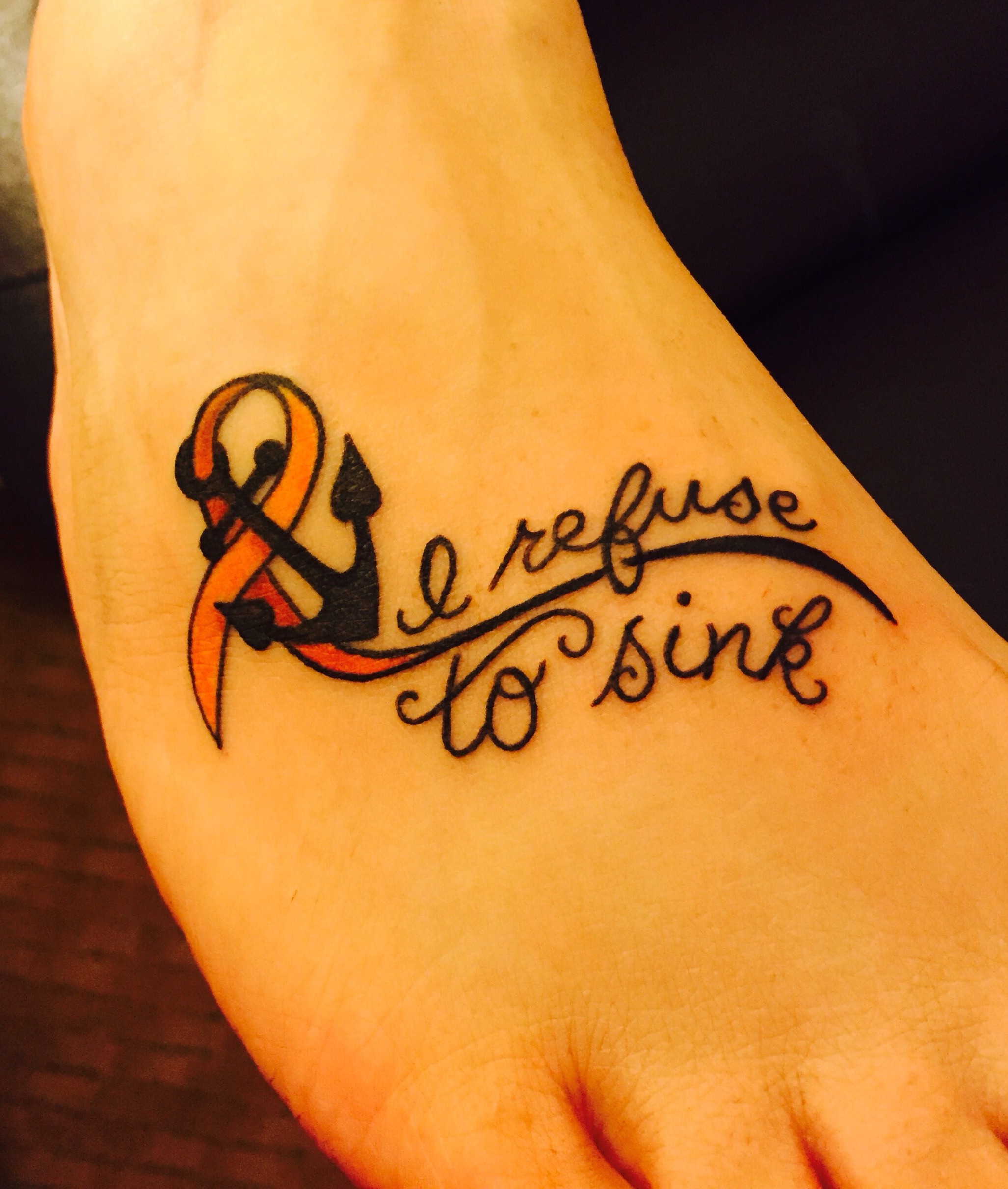 Refuse To Sink Anchor And Ribbon MS Fighter Tattoo On Right Foot