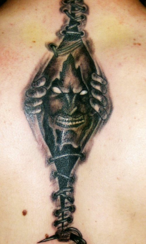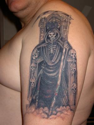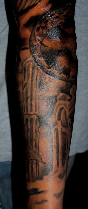 Unique Grey Ink Gothic Tattoo On Sleeve