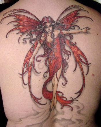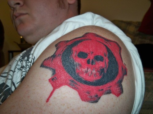 Red Ink Gothic Tattoo On Man Left Shoulder