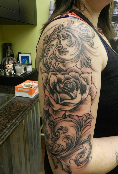 Grey Ink swirl And Rose Flower Half Sleeve Tattoo