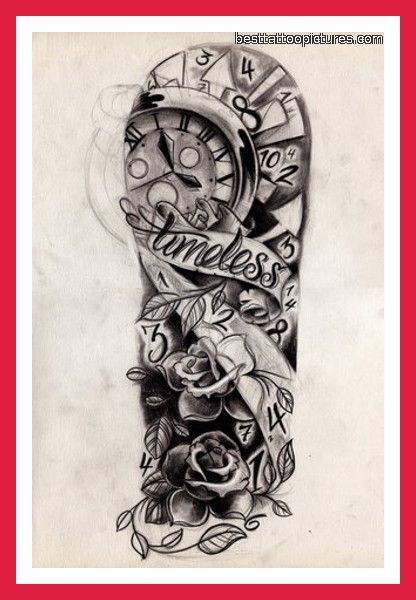 Timeless Banner With Clock Half Sleeve Tattoo Design Flash