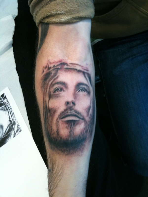 Forearm Grey Ink Jesus Tattoo