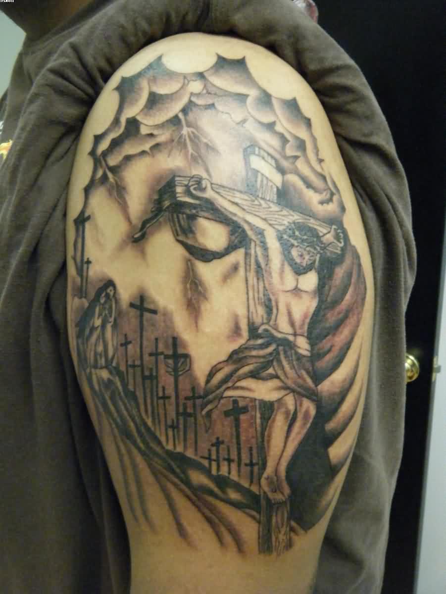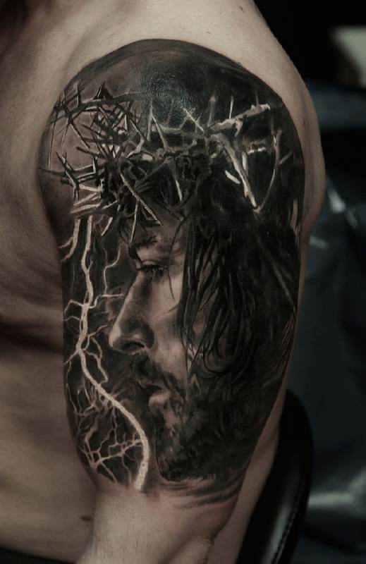 Left Shoulder Grey Ink Jesus Tattoo Idea
