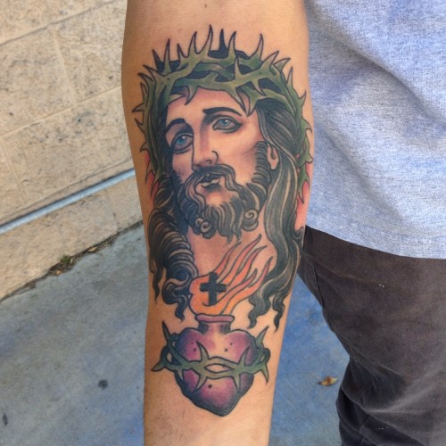 Sacred Heart And Jesus Portrait Tattoo On Forearm