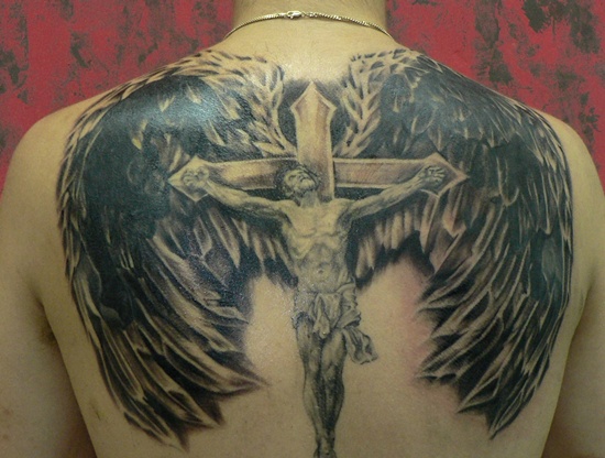 Winged Crucified Jesus Tattoo On Back