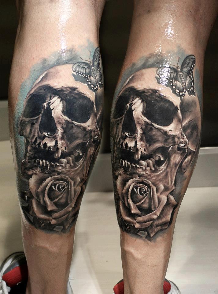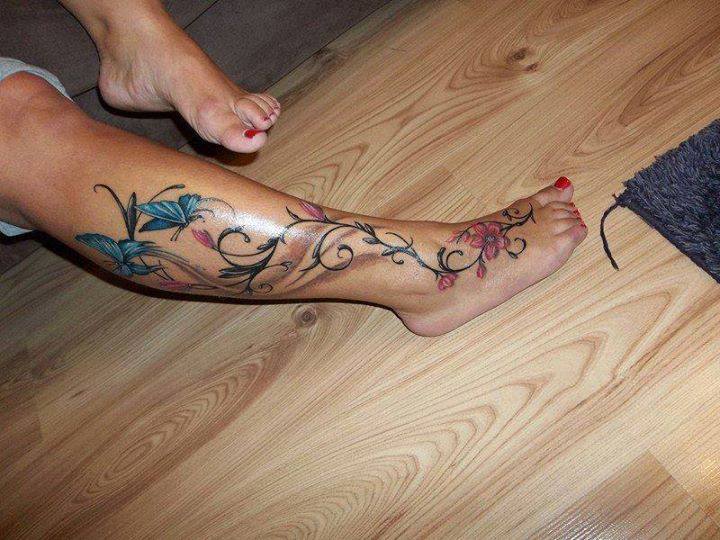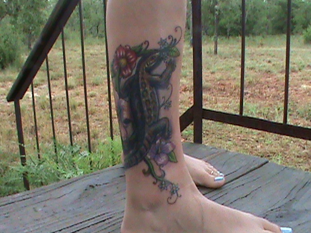 Red flower And Savannah Monitor Tattoo On Right Leg
