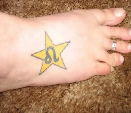 Yellow Star With Leo Sign Tattoo On Foot