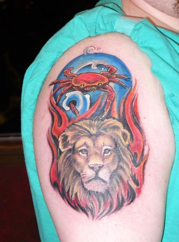 Zodiac Symbols Of Cancer And Leo Tattoo On Shoulder