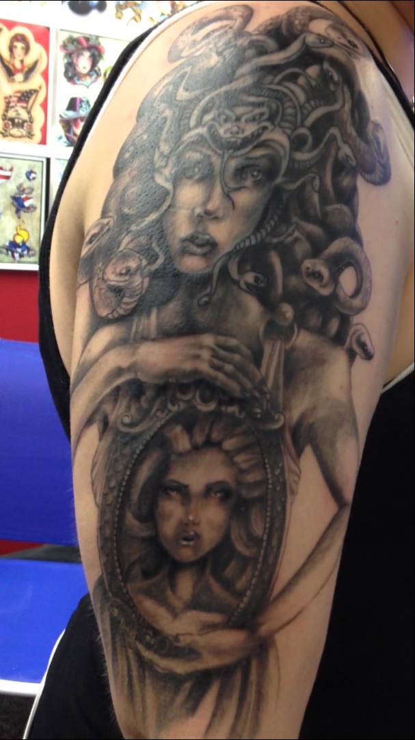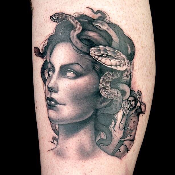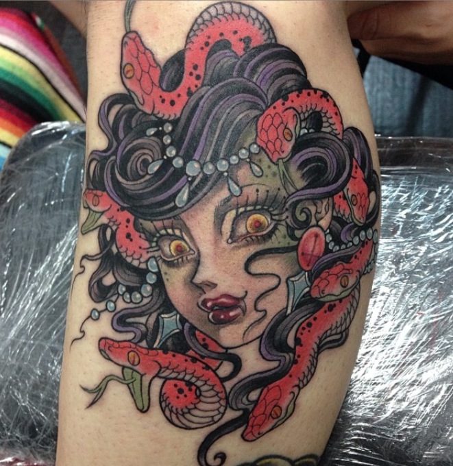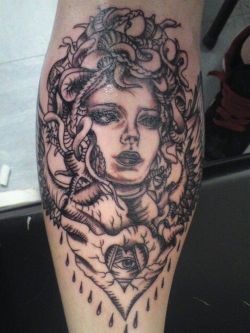 Small Eye Heart And Medusa Tattoo On Back Leg