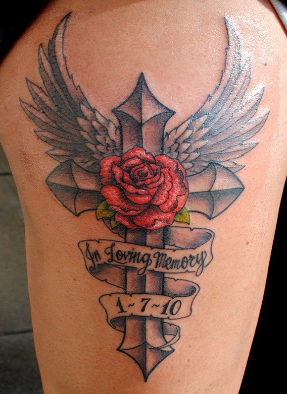 Memorial Wings Cross Cross Tattoo On Right Thigh