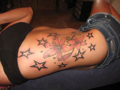 Lily Flowers And Star Tattoos On Girl Side Rib