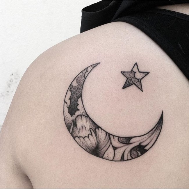 Nice Grey Ink Star With Moon Tattoo On Left Back Shoulder