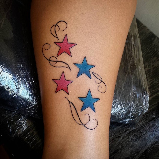 Red And Blue Ink Star Tattoos On Side Leg