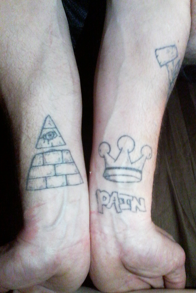 Grey Ink Bricks Pyramid And Crown Tattoos On Wrists