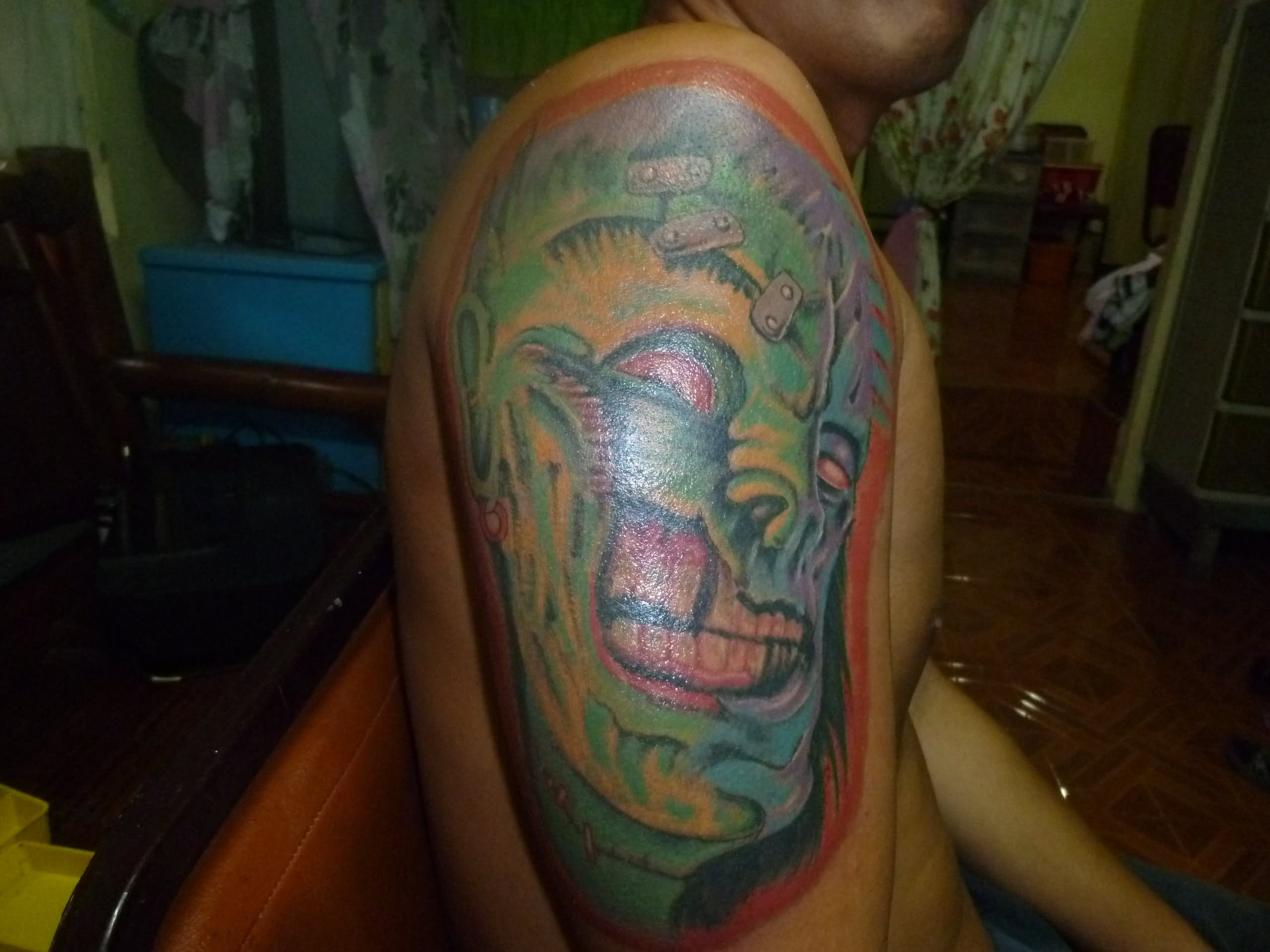 Colorful Zombie Face Tattoo On Half Sleeve