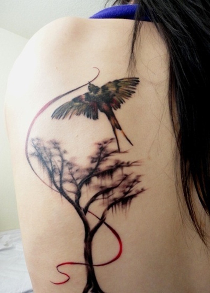 Gorgeous Tree And Bird Tattoo On Back