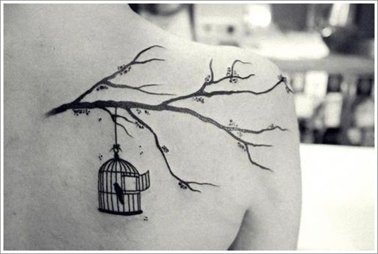 Cage On Tree And Bird Tattoo