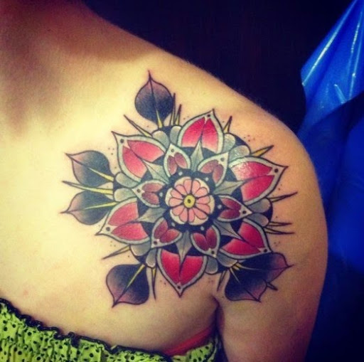 Grey And Black Flower Tattoos On Girl Front Shoulder