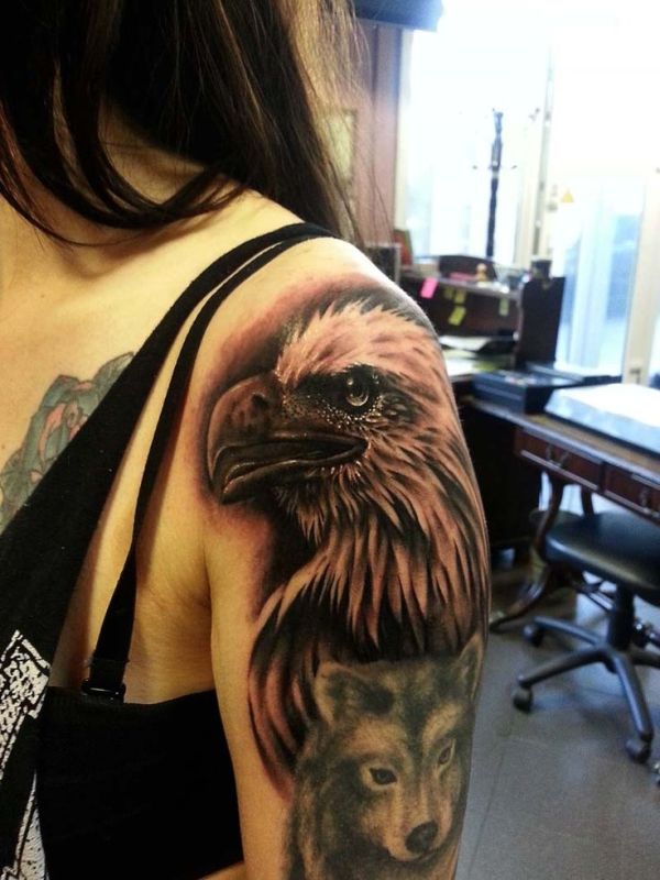 Dark Ink Eagle Head And Wolf Head Tattoo