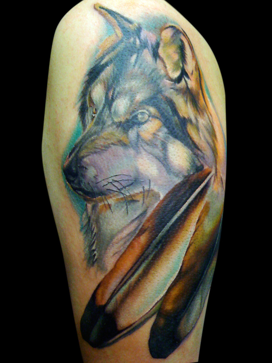 Wolf Head And Eagle Feather Tattoo On Half Sleeve