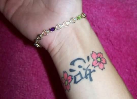 Chinese Symbol And Flowers Tattoos On Wrist
